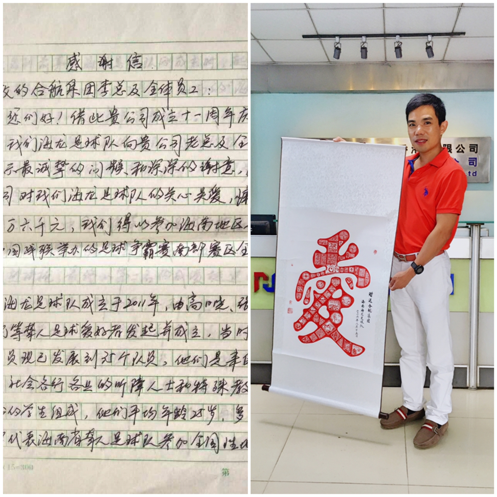 合航集團(tuán)愛心基金會(huì)自成立以來,一直秉持著關(guān)愛員工回饋社會(huì)的理念,為幫助這群可愛的孩子筑夢(mèng),合航集團(tuán)于2015年十周年慶典上向海南省海龍足球隊(duì)捐贈(zèng)人民幣五萬元整,并于2016年開始正式撥款資助球隊(duì)比賽。海龍足球隊(duì)為感謝合航集團(tuán)的關(guān)愛,特意為我司李董寄來了親筆感謝信及紀(jì)念品,讓愛散播在每個(gè)角落是我們共同努力的目標(biāo)。